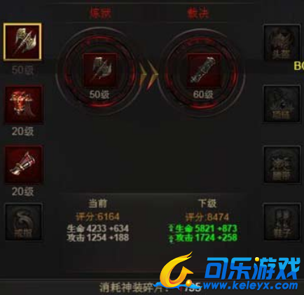 这里就是神器的玩法界面了,点击下方的升级可以消耗神装碎片来升级或者合成。如果之前没有神器,则是可以合成出符合当前等级的神装。