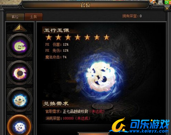 在游戏里,玉佩是一种强力装备,玩家可在官位面板消耗相应的荣誉值对其进行兑换。拥有玉佩,可极大提升人物PK伤害,PK免伤,还能增加物理攻击、魔法攻击、道术攻击的基础属性加成。当角色的官职达到相应等级,可使用相应的荣誉值兑换对应的玉佩。其中,玉佩品质越好,兑换时的官职需求越高,所消耗的荣誉值越大。