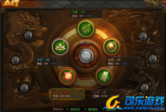 五行系统由金珠、木佩、水印、火石、土符组成。分别可增加神佑、生命、神圣、攻击、防御属性。当全部五行等级达到5,10,20,30,40,50级时可激活五行之力,增加大量五行基础属性及稀有属性。