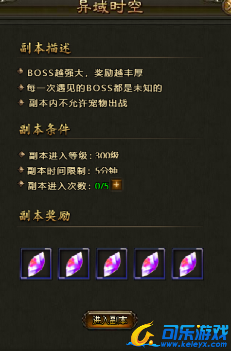 异界时空在玩家等级达到300级时开启,进入之后,玩家需要在没有宠物的情况下单挑刷新的BOSS,才算通关,通关时间5分钟。