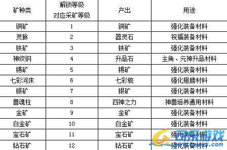 矿山,材料主要来源,强化、祝福装备,人物或者元神升品(升阶),强化神兽。矿种类分为:铜矿、灵脉、铁矿、神纹钢、锡矿、七彩河床、银矿等十多种。当玩家达到6级时开启矿山2种玩法。