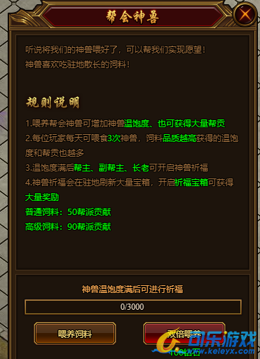 玩家可在帮会驻地采集饲料来喂养帮会神兽;每次只可采集一个饲料,确定收取饲料后才会获得饲料,饲料的等级越高喂养神兽获得的祝福值越高,祝福值满后,可由帮主、副帮主、长老开启神兽祈福!