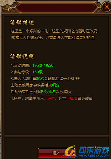 活动开始后,玩家在地图当中可随意PK,活动地图中会随机刷新:易伤、减少技能CD、增加超高额攻击力等随机事件。
