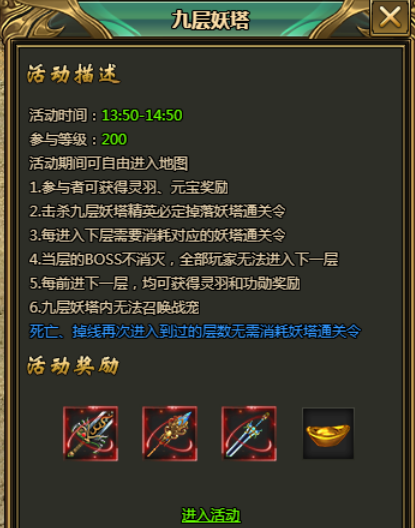 当玩家等级达到200级时可在九层妖塔活动时间通过九层妖塔NPC进入九层妖塔。