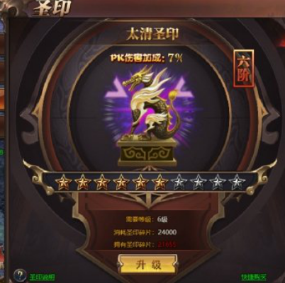 升级需要圣印碎片,圣印碎片可以通过赏金任务、押镖任务等获得,也可以在游戏的运营活动中获取。