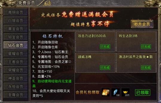 2.如果是打材料和做任务需要不少时间,可以直接成为钻石会员进入任意一张转生地图和等级地图,快速抢占资源。