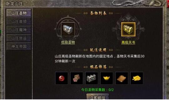 1、山庄圣物分为2种,分别为低级圣物和高级天书,高级天书每次被采集后30分钟后刷新,低级圣物刷新较快,采集高级天书可获得更好的奖励