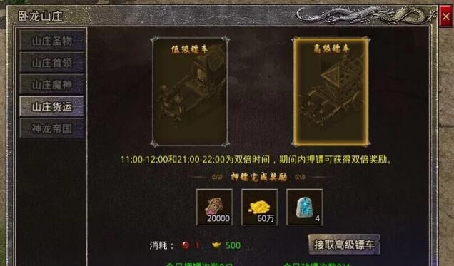1、山庄货运分为低级镖车和高级镖车,高级镖车奖励更丰厚