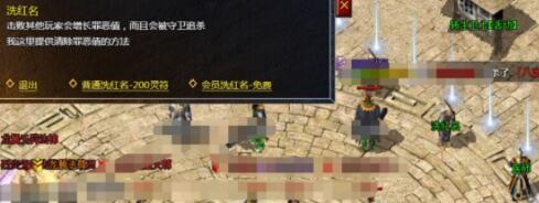 出现红名的玩家,如果想将红名洗掉,就可以前往盟重省的NPC“洗红名”处,消耗200灵符,可以快速清除红名的。如果大家是会员的话,可以免费洗红名的。此外,大家也可以在线挂机,可以慢慢消除罪恶值,罪恶值低于300点,即可消除红名哟。