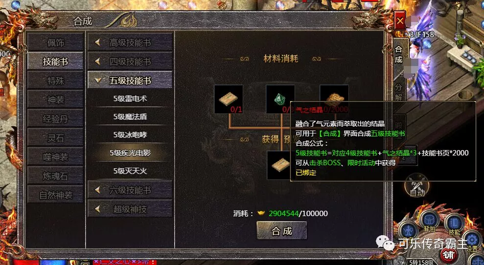 传奇霸主气之结晶是融合了气元素而萃取出的结晶,它是一种青灰色的石头状道具,它可用于【合成】界面合成五级技能书。合成公式:5级技能书=对应4级技能书+气之结晶*3+技能书页*2000。