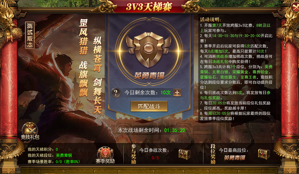 2、赛季时间:上赛季结算后每周一开启,每周日晚上20:00点结束。