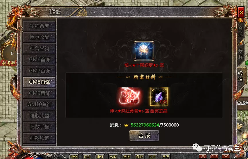传奇霸主GM装备的合成,需要消耗前一级的GM装备和【幽冥玄晶】的材料,幽冥玄晶可以通过回收GM8或以上的装备获得。