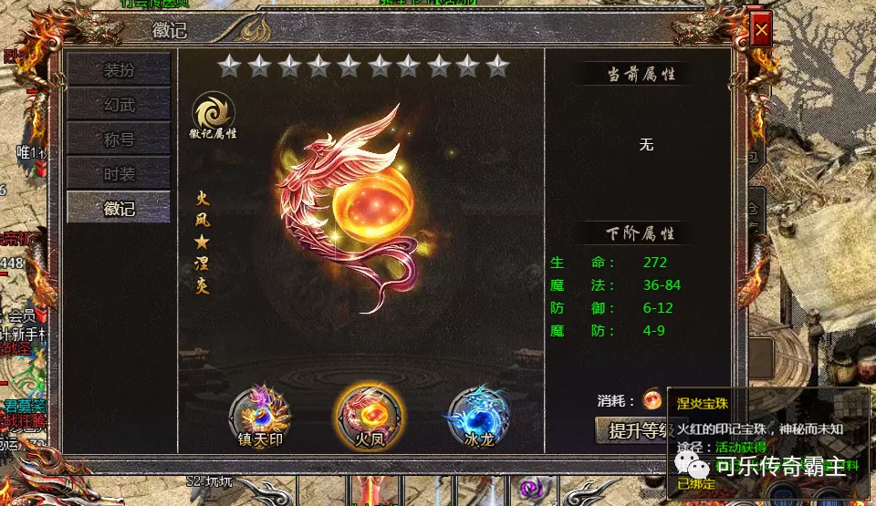 玩家持有足够的涅炎宝珠后,进入装扮里的徽记界面,就能选中火凤★涅炎的徽记去升级的。随着徽记的等级提升,消耗的涅炎宝珠越多的,同时你的战力也会得到相应提升的哟。