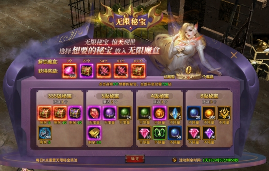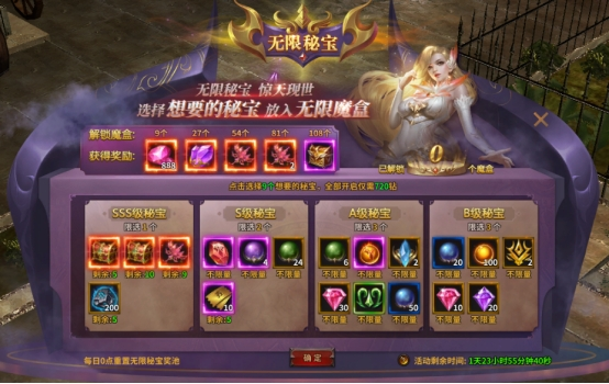 2、当获得全部自选SSS级秘宝时,可以开启新一轮秘宝。请注意每天0点会重置无限秘宝奖池,当日未开启的魔盒也会重置需要重新选择,选定心仪的奖励后请尽快开启魔盒哦~