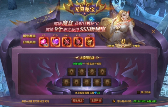 (2)在【魔盒解锁】阶段:自主选择的秘宝将会被随机放入9个魔盒中,玩家可以花费钻石去解锁魔盒。每解锁1个魔盒,将会获得1个已选择的秘宝。解锁9个魔盒后,必定获得之前选择的所有秘宝!