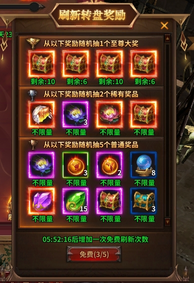 (3) 可通过刷新转盘来更改转盘奖励,选择自己心仪的至尊大奖。初始赠送一次免费刷新转盘次数,之后每隔8小时会增加1次,最多可累计3次免费刷新次数。也可以直接消耗钻石进行刷新转盘奖励