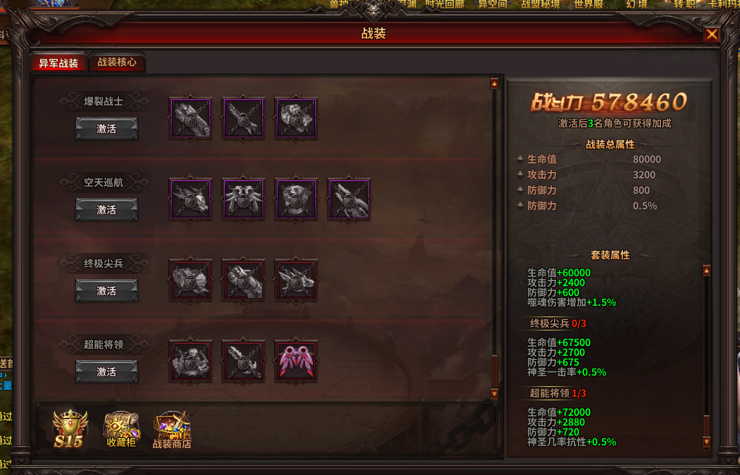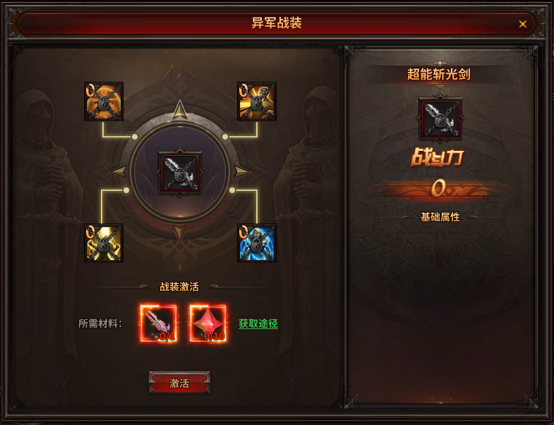 (2)激活战装、提升战装科技可获得大量属性加成。凑齐成套的异军战装还可获得对应的套装属性