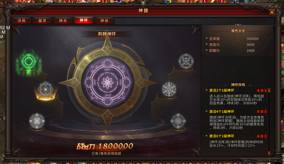 (1)收集神环可激活酷炫神环法阵,激活法阵可获得超强属性加成及技能