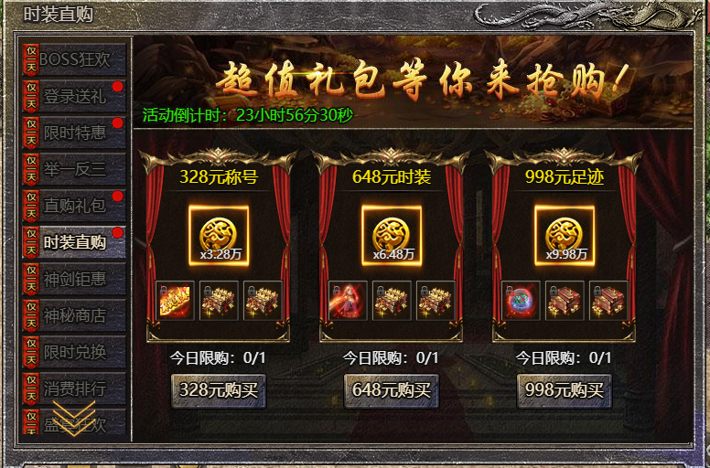 1.活动期间,玩家可在活动面板购买限购礼包,神剑特惠、神甲特惠、魔魂特惠、徽记特惠、经脉特惠、神阶特惠、荒古特惠、蛮王特惠