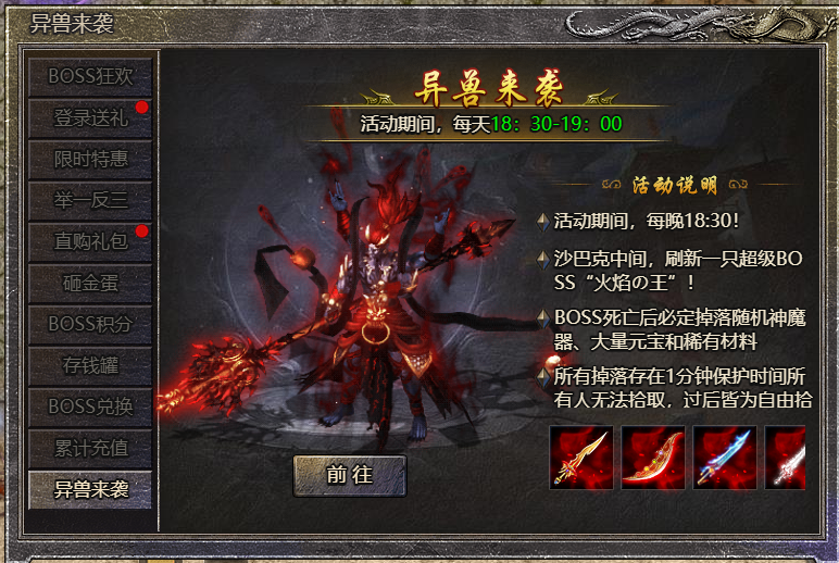 1.活动期间,每晚18:30将在沙巴克中间刷出一只超级BOSS;