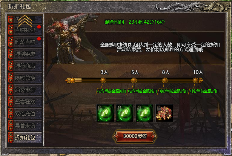 1.全服购买折扣礼包达到一定的人数,即可享受一定的折扣;