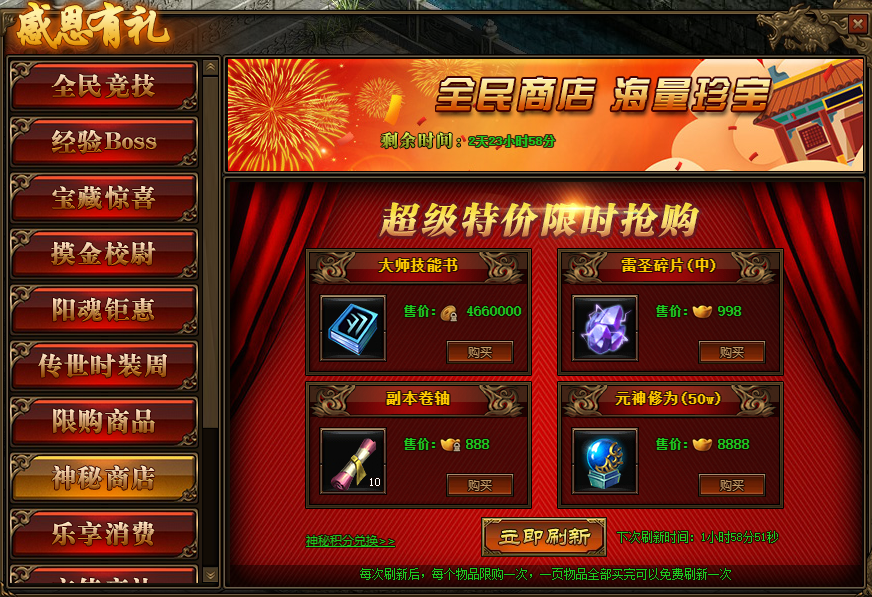 2.神秘商店每2小时自动刷新一次,也可用花费元宝立即刷新;