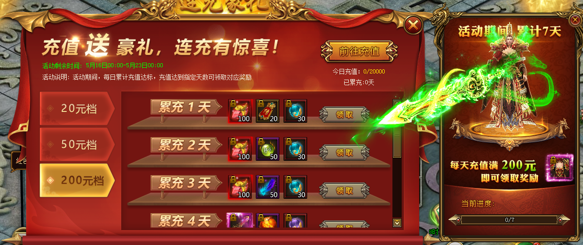 活动说明:活动期间,每日累计充值达标,充值达到指定天数可领取对应奖励