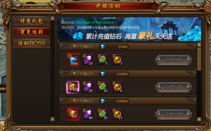 活动期间累计充值达标即可领取豪华奖励,配合其他活动更配哦