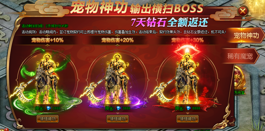 活动期间,购买宠物增伤效果,宠物获得特效阵法外观,活动结束后,钻石全额返还