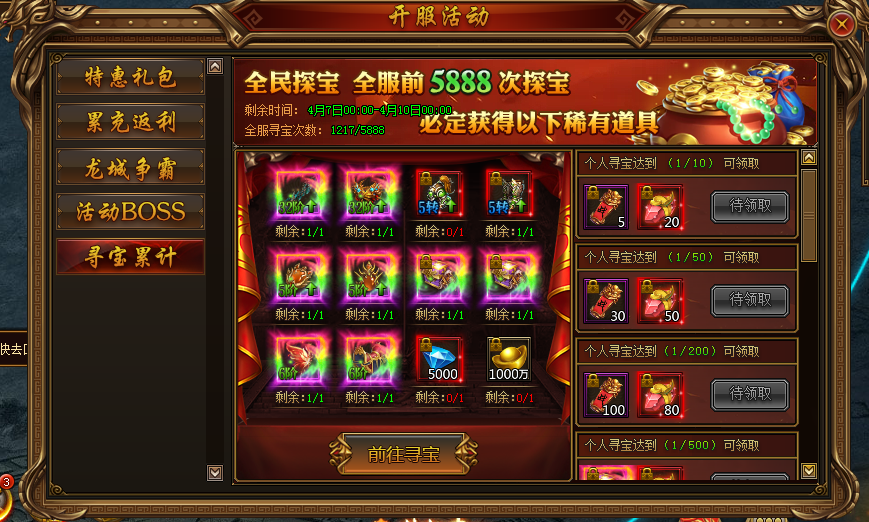 活动期间,前N次里寻宝必定获得稀有道具,达到寻宝次数可领取奖励