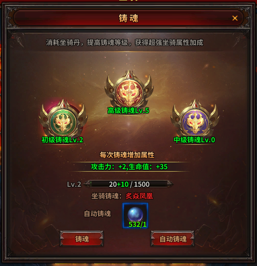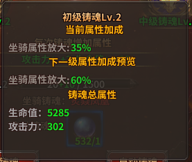 (2)使用多余的坐骑丹可提高铸魂等级,获得大量坐骑属性加成