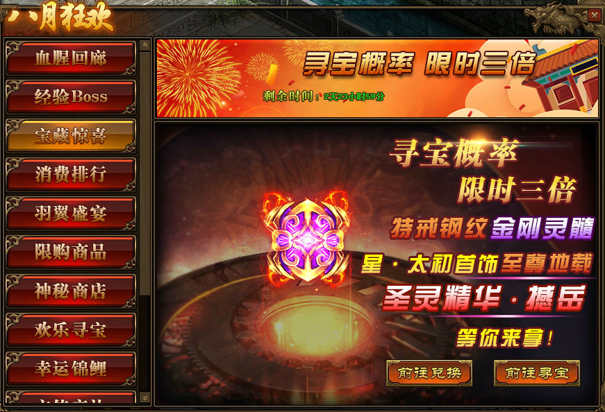 1.活动期间,玩家寻宝概率翻倍,极高几率获得星·太初首饰,传世灵器、传世灵甲,特戒钢纹,仙元石、碧落星空,传世灵器、传世灵甲,金刚灵髓、金刚精华,至尊风扬阵法以及圣灵精华(撼岳)