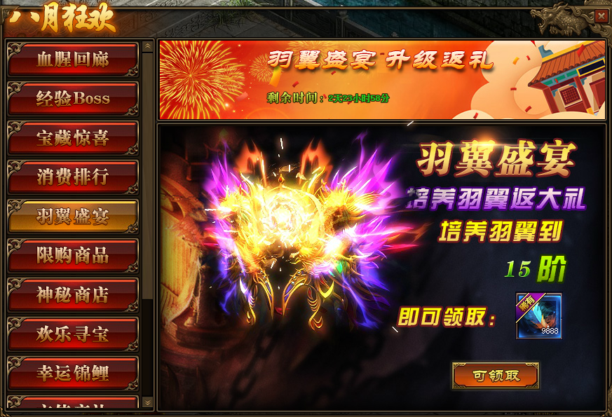 1.活动期间,玩家羽翼只需达到5级,即可领取一定数量的羽毛;