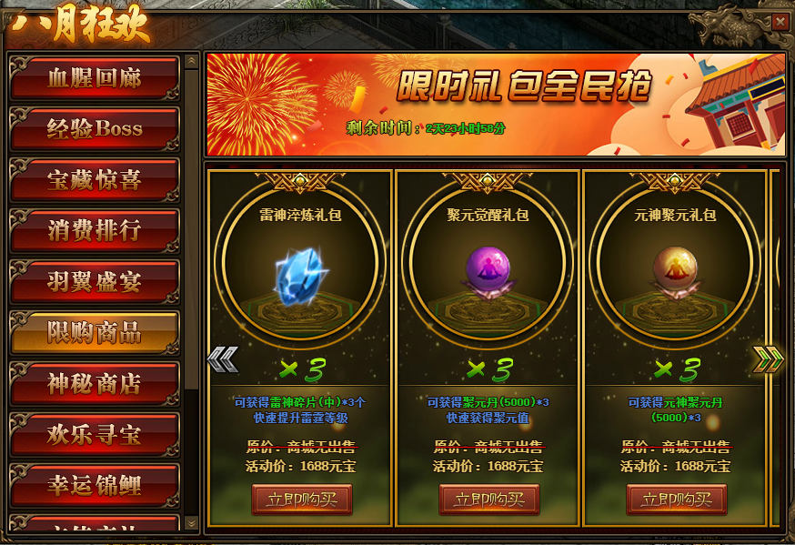 1.活动期间,玩家可在活动面板购买限购商品;(可翻页)