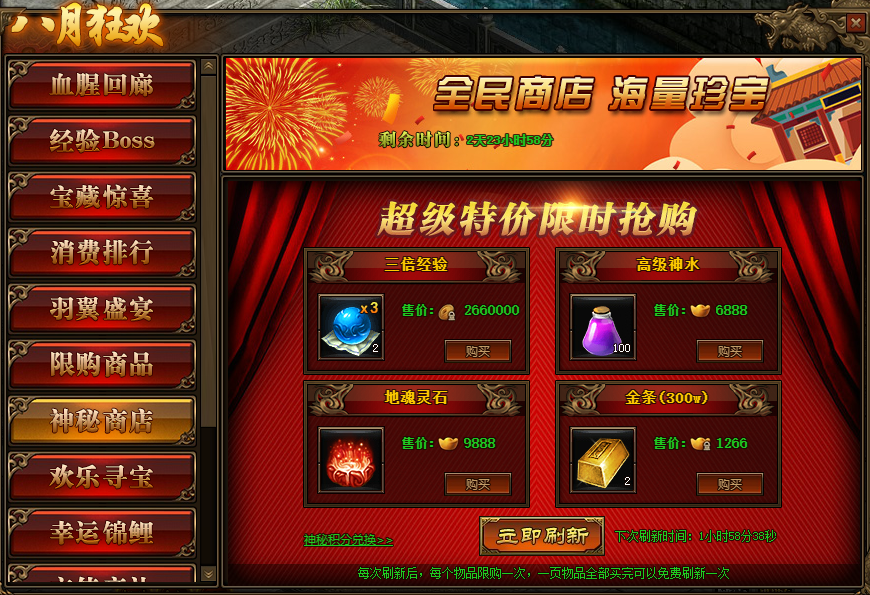 1.活动期间,玩家可在神秘商店中购买商品,商品可用金币,绑元,元宝进行购买;