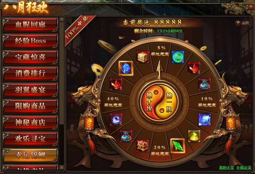 1.活动开启后奖池内默认存入88888元宝,每抽奖1次可使奖池内增加100元宝