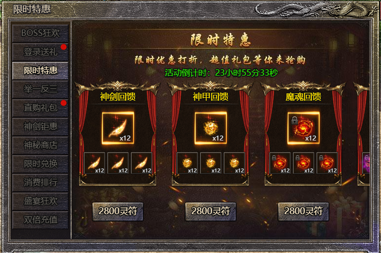 1.活动期间,玩家可在活动面板购买限购礼包,神剑特惠、神甲特惠、魔魂特惠、徽记特惠、经脉特惠、神阶特惠、荒古特惠、蛮王特惠、铭文特惠