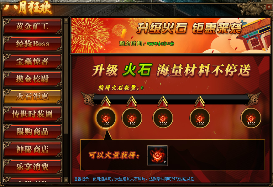 1.活动期间,玩家获得火石碎片数量,达到条件可领取对应火石碎片奖励。