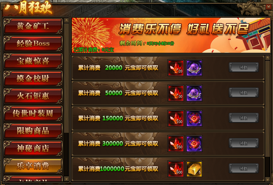 1.活动期间,玩家累计消费满足要求,可以领取境界修为、本职业星石、传世灵戒等相应奖励;