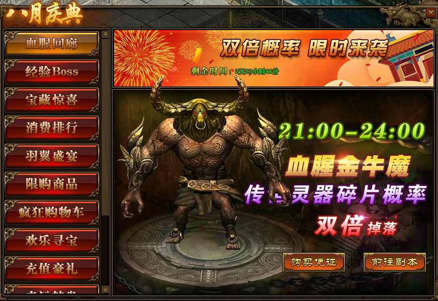 1.活动期间,玩家参与“多人副本-血腥回廊”,获得“传世灵器碎片”的概率翻倍;
