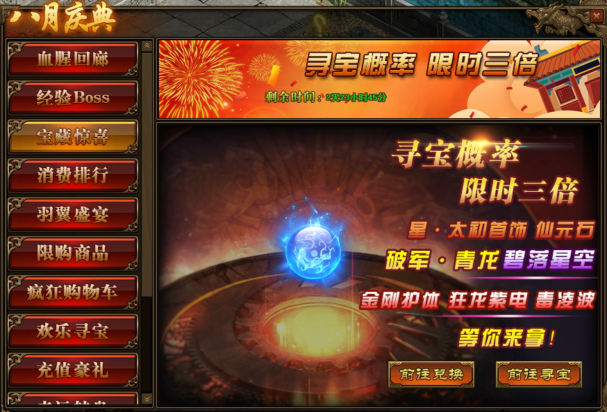 1.活动期间,玩家寻宝概率翻倍,极高几率获得星·太初首饰,特戒钢纹、仙元石、碧落星空,传世灵器、传世灵甲,封神秘法书页以及破军·青龙