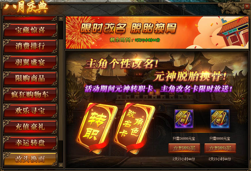 1.活动期间,玩家可在活动面板中购买元神转职卡,让元神脱胎换骨;