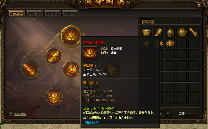 d.轮回战装放在玩家背包或者穿戴在身上时,死亡有几率掉落;轮回战装放在战装背包时死亡不会掉落;