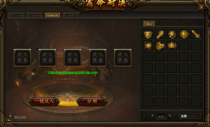 1.系统开启:开服90天,等级大于90级,转生等级大于10级,通过【宿命对决-轮回战装-战装回收】进入战装回收系统;