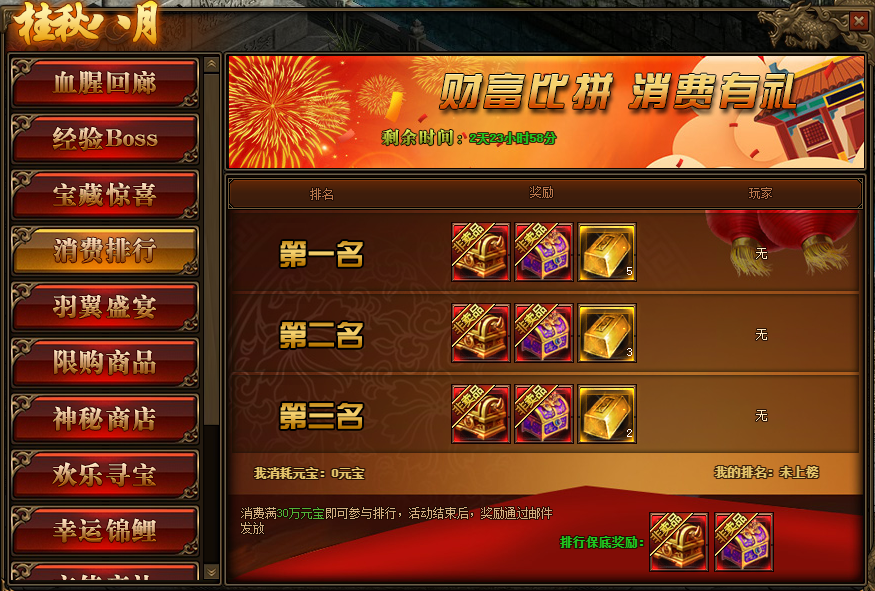 第二名:数一数二自选宝箱,低级灵器自选宝箱*1*1,金条(300w)*3;