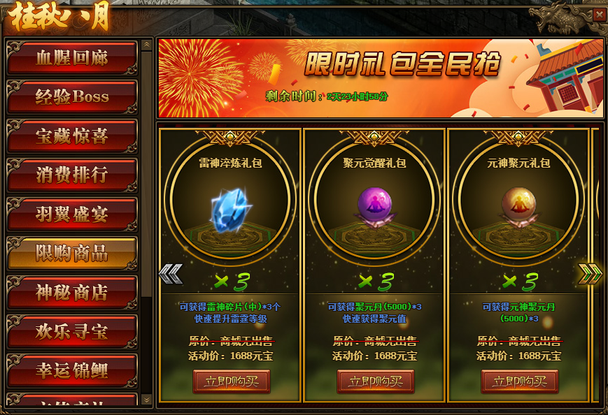 1.活动期间,玩家可在活动面板购买限购商品;(可翻页)