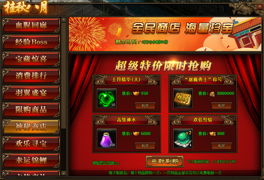 1.活动期间,玩家可在神秘商店中购买商品,商品可用金币,绑元,元宝进行购买;