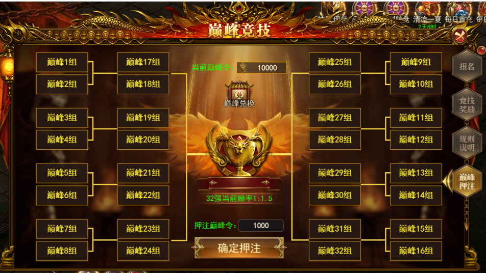 2.巅峰押注:巅峰比赛开启后,可用巅峰令进行押注,押注胜利获得奖励。