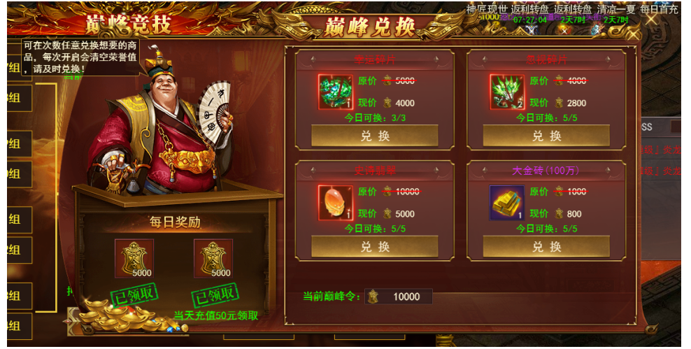 3.巅峰兑换:巅峰令可用来兑换兑换稀有道具,下次开启巅峰竞技会清空重置巅峰令,请及时兑换。