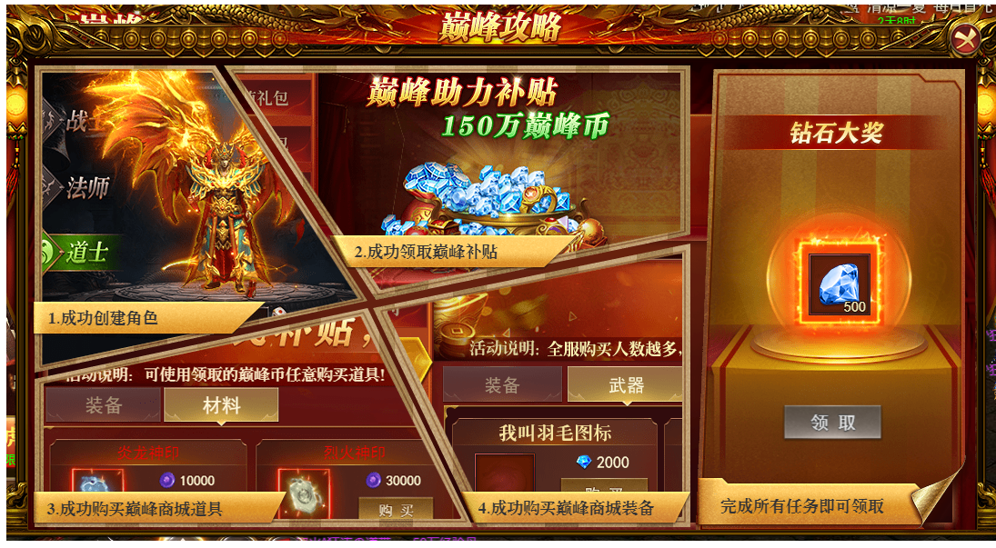 2.巅峰攻略:完成了巅峰竞技的4个基础指引任务后,即可领取钻石奖励。